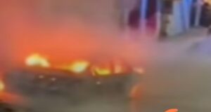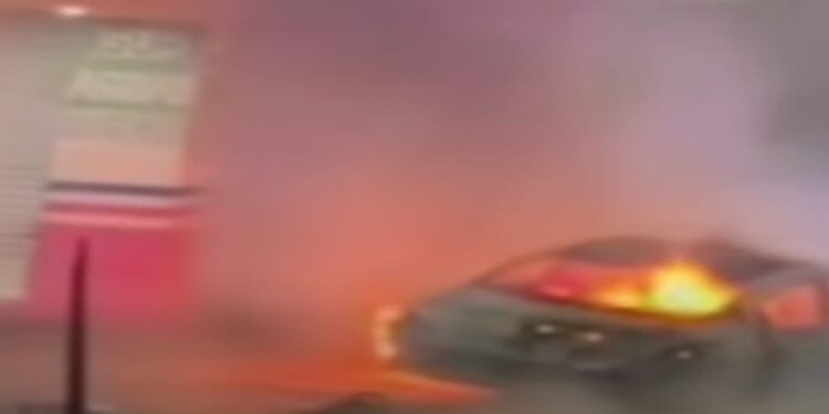 TECOMÁN, Col., 15 de febrero de 2026.- En la madrugada de este domingo un carro explotó y se incendió en pleno centro de Tecomán muy cerca del edificio de la Presidencia Municipal, causando una gran alarma ante el temor de que el hecho se debiera a un atentado con un carro bomba.
