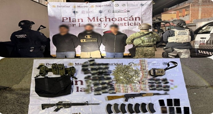 JIQUILPAN, Mich., 24 de febrero del 2026.- Como resultado de un operativo interinstitucional, elementos de las secretarías de Seguridad Pública (SSP), de la Defensa Nacional (Defensa) y Guardia Nacional (GN) detuvieron a tres hombres en posesión de tres armas de fuego, más de 200 cartuchos útiles y 32 dosis de hierba verde, al parecer mariguana.