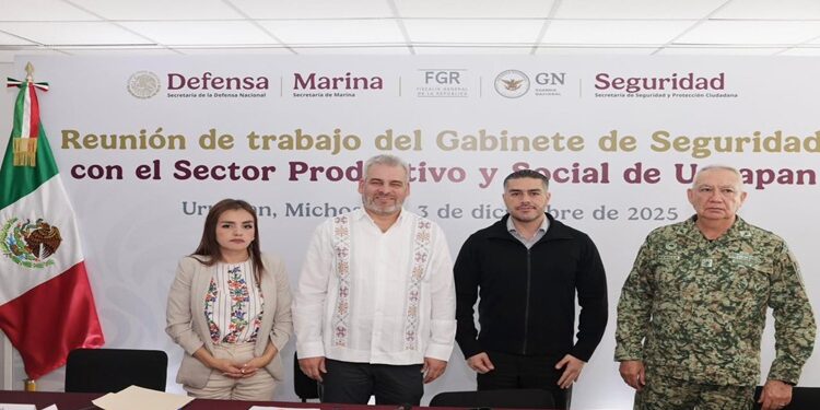 URUAPAN, Mich., 3 de diciembre de 2025.- El gobernador Alfredo Ramírez Bedolla; el secretario de Seguridad y Protección Ciudadana del Gobierno de México, Omar García Harfuch, y el general Ricardo Trevilla Trejo de la Defensa Nacional, encabezaron reunión de seguimiento a las acciones de seguridad del Plan Uruapan con la participación de la presidenta municipal, Grecia Quiroz y el sector productivo.