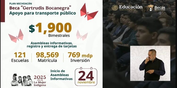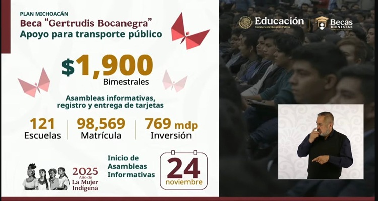 MORELIA, Mich., 17 de noviembre de 2025.- Más de 98 mil 500 jóvenes universitarios en el estado serán beneficiados con la Beca Gertrudis Bocanegra, un apoyo económico de mil 900 pesos bimestrales para que no abandonen sus estudios por falta de recursos, informó el gobernador Alfredo Ramírez Bedolla.