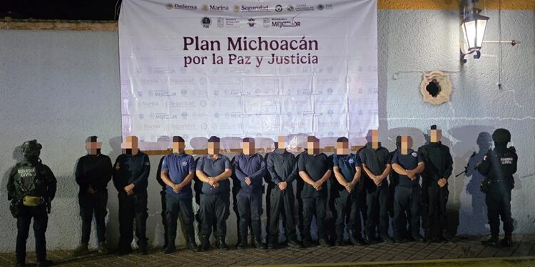 ECUANDUREO, Mich., 24 de febrero del 2026.- Elementos de la Secretaría de Seguridad Pública (SSP) detuvieron a 11 policías del municipio de Ecuandureo, entre los que se encuentra el director de Seguridad Pública Municipal, por estar presuntamente relacionados con actividades ilícitas y posesión de drogas.