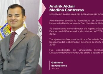 MORELIA, Mich., 14 de agosto de 2025.- El gobernador Alfredo Ramírez Bedolla designó a Andrik Aldair Medina Contreras como secretario...