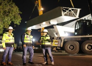 MORELIA, Mich., 7 de julio de 2025.- Al supervisar el avance y colocación de una trabe metálica en el paso...