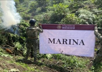 AQUILA, Mich., 15 de enero de 2025.- Elementos de la Secretaría de Marina (Semar) localizaron y aseguraron dos plantíos de...