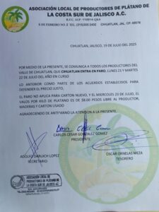 CIHUATLÁN, Jal., 20 de julio de 2025.- Este sábado, la Asociación Local de Productores de Plátano de la Costa Sur de Jalisco, Asociación Civil, a través de un comunicado dio a conocer a todos los plataneros del Valle de Cihuatlán, que por acuerdo de asamblea a partir de este lunes 21 y el martes 22 entrará en vigor un paro de corte de cosecha y comercialización para la fruta variedad enano gigante calidad reja de madera y cartón usado.