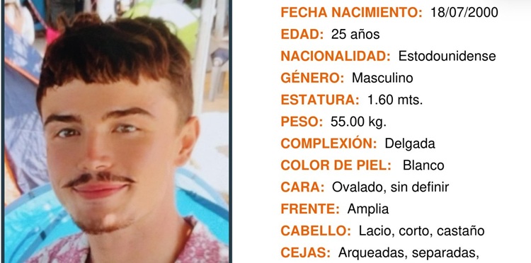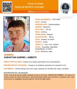 AQUILA, Mich., 11 de febrero de 2026.- Con fecha 3 de febrero del presente año la Fiscalía General del Estado de Michoacán (FGE) recibió el reporte de la desaparición del joven Sebastián Gabriel Lambeth de nacionalidad americana, mismo que fue visto por última vez en el centro del pueblo de Aquila alrededor de las 21 horas del 12 de enero de 2026, desconociéndose desde entonces su paradero, por lo que se teme por su integridad ya que puede ser víctima de un delito.