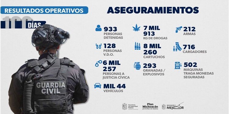 MORELIA, Mich., 6 de marzo de 2026.- A 100 días de asumir la titularidad de la Secretaría de Seguridad Pública (SSP), José Antonio Cruz Medina presentó los principales resultados operativos mediante la estrategia del Plan Michoacán por la Paz y la Justicia, donde destacó la detención de 933 personas, el aseguramiento de 7 mil 913 kilogramos de droga, 212 armas de fuego y mil 044 vehículos con reporte de robo o relacionados en actividades ilícitas, efectuados en diversas regiones del estado.