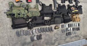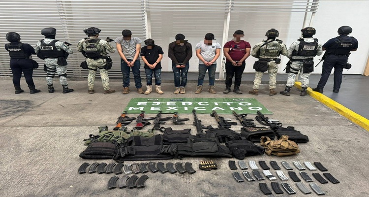 Durante la detención, se logró aseguramiento de ocho armas largas de distintos calibres, así como mil 167 cartuchos útiles, 77 cargadores, chalecos tácticos y cascos balísticos.