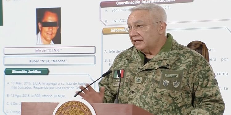 CIUDAD DE MÉXICO, 23 de febrero de 2026.- El titular de la Secretaría de la Defensa Nacional, Ricardo Trevilla Trejo, informó que labores de inteligencia permitieron ubicar a Nemesio Oseguera Cervantes, alias El Mencho, líder del Cártel Jalisco Nueva Generación (CJNG), a partir del seguimiento a una de sus parejas sentimentales.