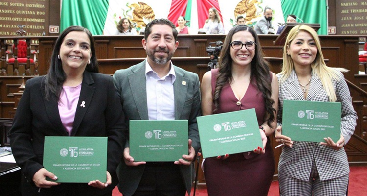 MORELIA, Mich., 8 de octubre de 2025.- Este miércoles el diputado Abraham Espinoza Villa, El Doc, como presidente de la Comisión de Salud, junto a las diputadas Teresita Herrera y Sandra Garibay, entregaron el Primer Informe de Trabajos a la presidenta del Congreso, Giuliana Bugarini Torres.