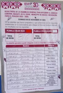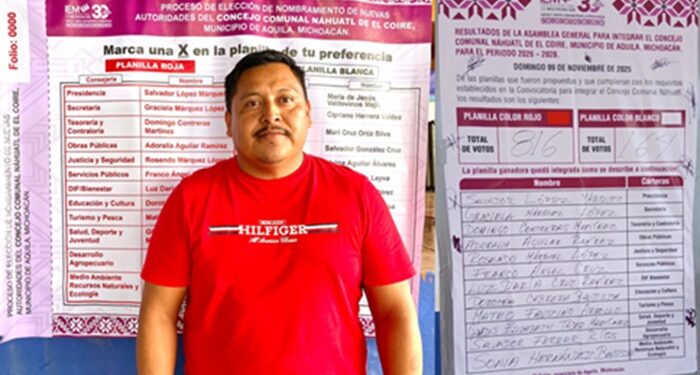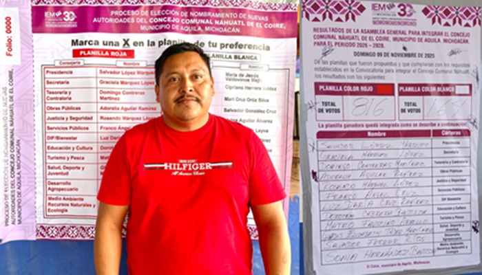 AQUILA, Mich., 9 de noviembre de 2025.- Este domingo en la costa/sierra nahua de Aquila, en un ambiente de paz y cordialidad, bajo la conducción del Instituto Electoral de Michoacán llevó a cabo la elección de la nueva mesa directiva del Concejo Comunal Náhuatl de El Coire, también identificado como el Autogobierno, donde resultó ganadora la planilla roja encabezada por Salvador López Márquez, con 816 votos a favor, en tanto que la planilla blanca obtuvo 164.