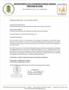 Por este medio me dirijo a los productores del municipio de Coahuayana y del Pacífico Centro Mexicano, para exhortarlos a sumarse a la estrategia de defensa del precio del plátano, uniéndonos para exigir un mejor pago por nuestra fruta que como mínimo iguale el costo que están pagando en el sureste del país