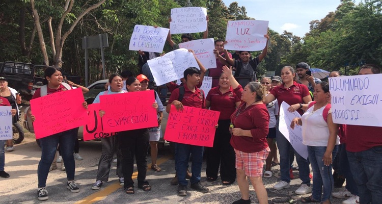 En el lugar la comunidad estudiantil de la UIIM en cartulinas presenta las siguientes demandas: Exigimos instalaciones dignas de la sede UIIM; Exigimos luz electricidad y sanitarios dignos; Sede Costa no se olvida, se exige lo prometido; ¡Exigimos! atención de la rectora UIIM Jenifer; Articulo 7 libertad de Expresión; Exigimos servicio eléctrico e instalaciones dignas UIIM; ¡Ya basta de promesas a la UIIM!!; Exigimos luz eléctrica en la institución; Exigimos nuestros derechos como estudiantes de la UIIM Faro de Bucerías.