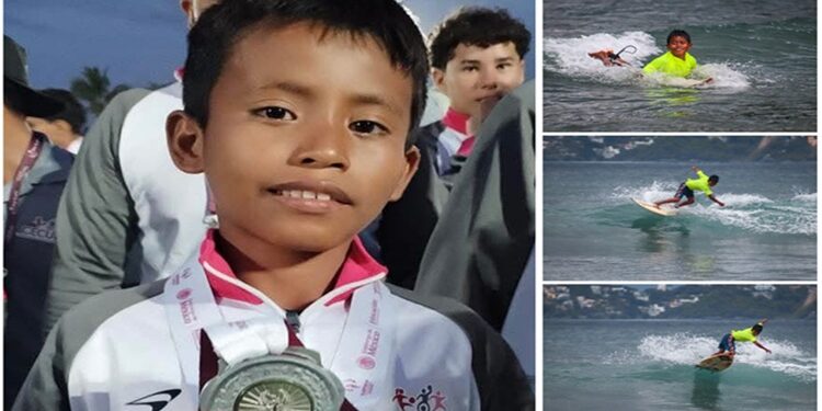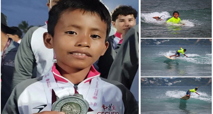 AQUILA, Mich., 21 de junio de 2025.- Un pequeño surfista de la Costa de Aquila del paradisiaco centro turístico La Ticla de nombre Oscar Nemecio, ganó medalla de plata, pero sobre todo los corazones de los participantes y espectadores de la competencia de Surfing de la Olimpiada Nacional 2025 organizada por la Comisión Nacional del Deporte (Conade) en las playas del municipio de Manzanillo, Colima.
