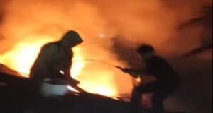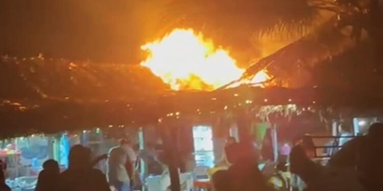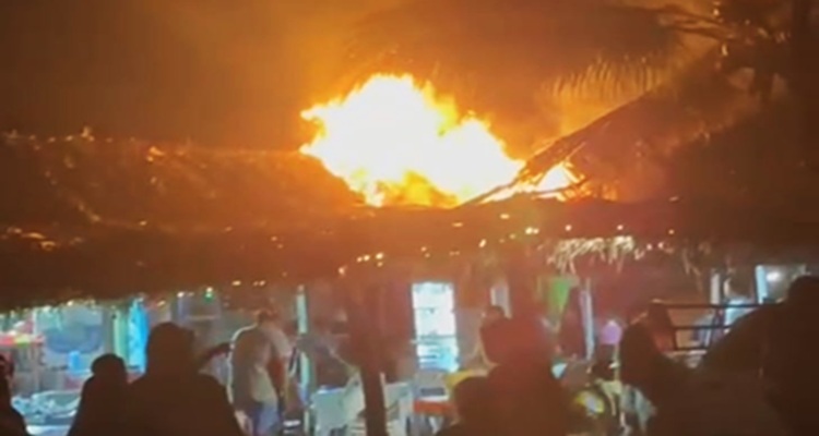 AQUILA, Mich., 1 de enero de 2026.- En los primeros minutos del año 2026, la ramada del señor Quirino García del afamado centro turístico Maruata, se incendió como consecuencia del uso de un cohete de pirotecnia que cayó sobre la palapa, iniciando el fuego que afortunadamente se logró controlar por lugareños y turistas que unieron esfuerzos para evitar que la lumbre se extendiera a todo el negocio y a otros vecinos.