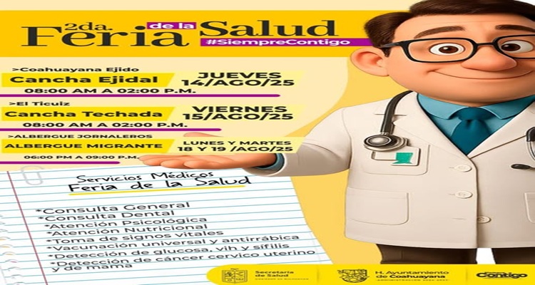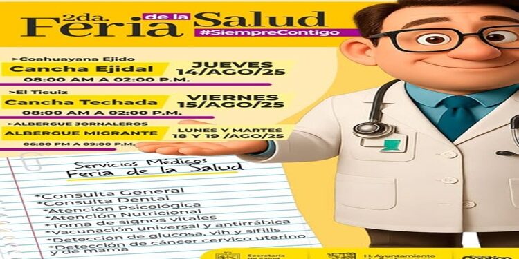 COAHUAYANA, Mich., 14 agosto de 2025.– El Ayuntamiento de Coahuayana que preside Andrés Rafael Aguilar Mendoza, en coordinación con la Jurisdicción Sanitaria 8 y la Secretaría de Marina, anunció la realización de la segunda Feria de la Salud Siempre Contigo, un evento diseñado para acercar atención médica gratuita y de calidad a todas las familias del municipio.