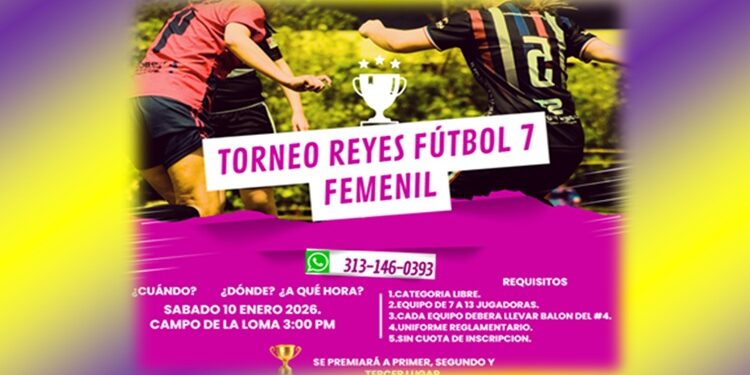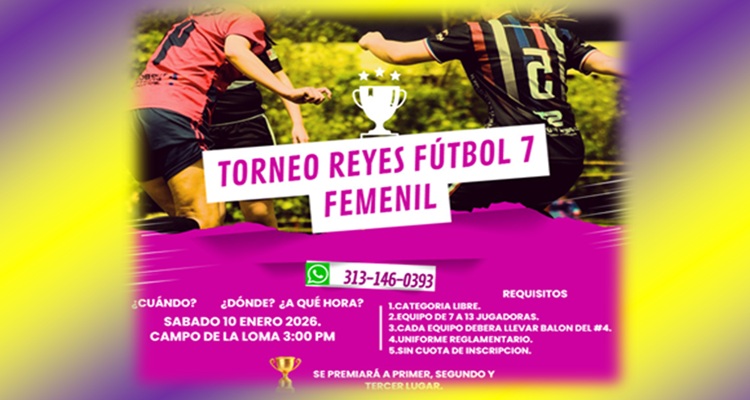COAHUAYANA, Mich., 7 de enero de 2026.- El conocido promotor deportivo Alonso Rauda y su hija Leilani están invitando a las futbolistas coahuayanenses y al público en general al gran Torneo de Reyes de fútbol 7 femenil que se celebrará el próximo sábado 10 del mes en curso a partir de las 15 horas (tres de la tarde) en el campo de La Loma en la Unidad Deportiva de Coahuayana de Hidalgo.