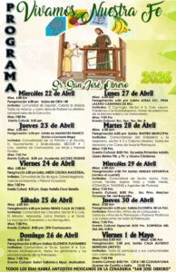 Para el domingo 26 de abril, se contempla misa a las 6:00 horas y peregrinación a las 18:00 horas desde la Glorieta Platanero, con participación de comunidades locales, seguida de misa a las 19:00 horas y presentación cultural de ballet folklórico.
