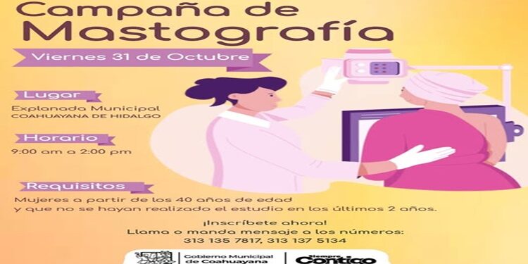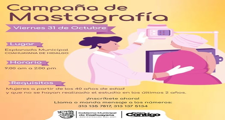 COAHUAYANA, Mich., 21 de octubre de 2025.- El ayuntamiento de Coahuayana que preside Andrés Rafael Aguilar Mendoza, Pay, invita a la campaña gratuita de mastografía dirigida a mujeres del municipio, con el objetivo de fomentar la detección oportuna del cáncer de mama.