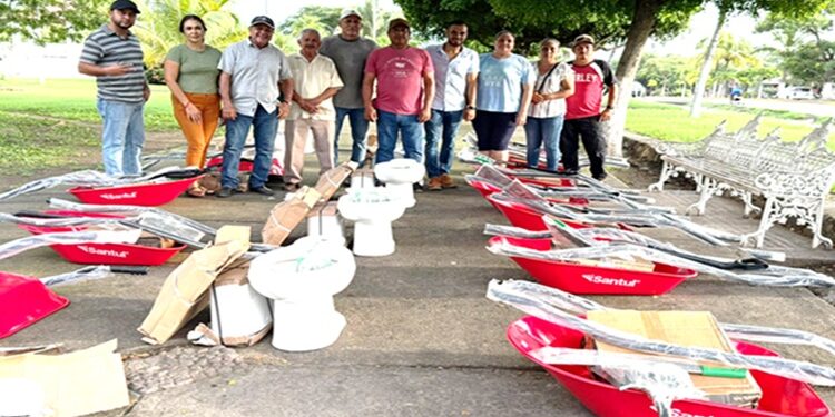 Teniendo como marco el jardín del pueblo El Ranchito, el Lic Memo entregó paquetes de carretillas, machete, rastrillo y pala, así como también promociones de baño grande con su lavamanos, todo a bajo precio.