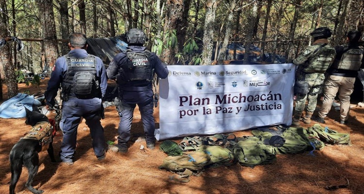 QUERÉNDARO, Mich., 28 de febrero de 2026.- Como parte de las acciones del Plan Michoacán por la Paz y la Justicia, elementos de la Secretaría de Seguridad Pública de Michoacán (SSP), en coordinación con la Secretaría de la Defensa Nacional (Defensa) y la Fiscalía General del Estado de Michoacán (FGE), localizaron y desmantelaron un asentamiento provisional presuntamente utilizado para actividades ilícitas en una zona serrana del municipio.