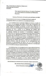 Pronunciamiento de la tenencia indígena de Huahua sobre el presupuesto directo que solicita la comunidad de Pomaro.