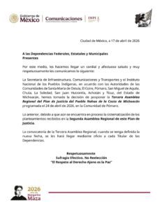 AQUILA, Mich., 23 de abril de 2026.- Este miércoles y jueves se dio a conocer que se suspende hasta nuevo aviso la Tercera Asamblea Regional del Plan de Justicia del Pueblo Nahua de la Costa de Michoacán programada para celebrarse en la Comunidad Indígena de Pomaro de los Santos Reyes.