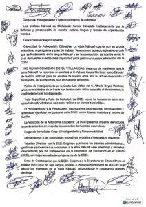 En resumen, el manifiesto de la Nación Náhuatl de Michoacán ¡Basta ya de hostigamiento!, de manera destacada se precisa que desde enero del presente año se deslindaron y no reconocen a la Dirección General Indígena de Michoacán ni a su titular como autoridades educativas, y que su interlocución y coordinación académica es directa con la Secretaría de Educación en el Estado (SEE).