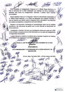 AQUILA, Mich., 6 de octubre de 2025.- De pie y en lucha es como se encuentra el magisterio nahua de la Costa de Aquila, los que a través de un manifiesto publicado este fin de semana exigen respeto a sus derechos de pueblos originarios, y además denuncian hostigamiento, persecución y amenazas del grupo purépecha encabezado por Alfredo Reyes, director que fue desconocido por los maestros náhuatl como titular de la Dirección General de Educación Indígena (DGEI) de Michoacán.