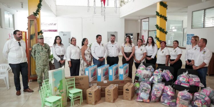 Durante la visita se entregó equipamiento y kits de gestión menstrual destinados al fortalecimiento del Centro LIBRE de Coahuayana, una acción que forma parte del compromiso permanente para ampliar la red de apoyo y mejorar los servicios dirigidos a mujeres y niñas del municipio. A la par, el encargado de la política interna también supervisó los daños registrados en el Jardín de Niños “Jonas Salk”.