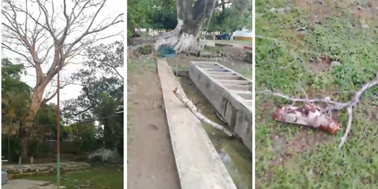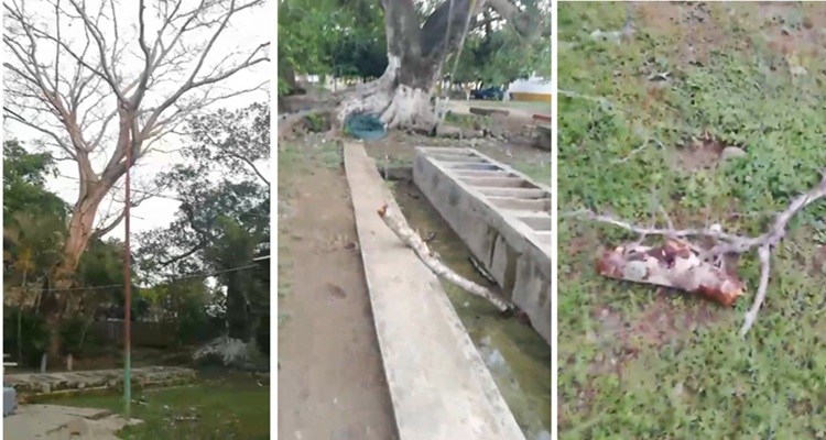 A través de un video publicado en las redes sociales, se aprecia como el árbol Parota de gran altura está totalmente seco, mismo que con motivo de las primeras lluvias está cayendo a pedazos tumbando ramas y fragmentos de estas de gran peso, lo que puede lesionar o matar a una persona, o también causar daños graves a un vehículo que esté estacionado o vaya pasando por la calle.