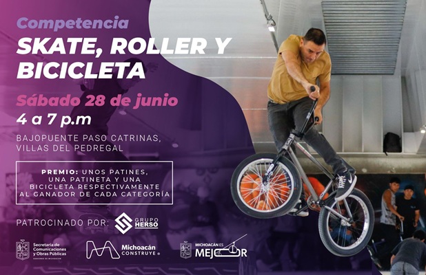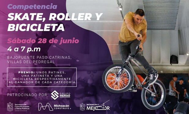 MORELIA, Mich., 19 de junio de 2025.- Para fomentar la sana actividad física y promover los deportes extremos, la Secretaría de Comunicaciones y Obras Públicas (SCOP) invita a los jóvenes a participar en la competencia de Skate, Roller y Bicicleta. El evento se realizará este sábado 28 de junio, de 16:00 a 19:00 horas, en la zona de skatepark de Paso Catrinas, a la altura de Villas del Pedregal en Morelia.