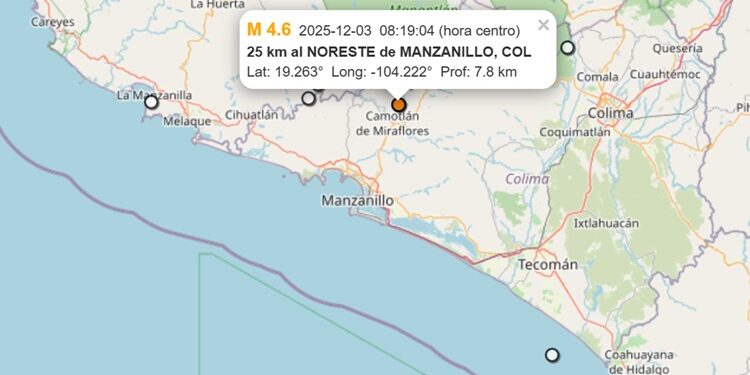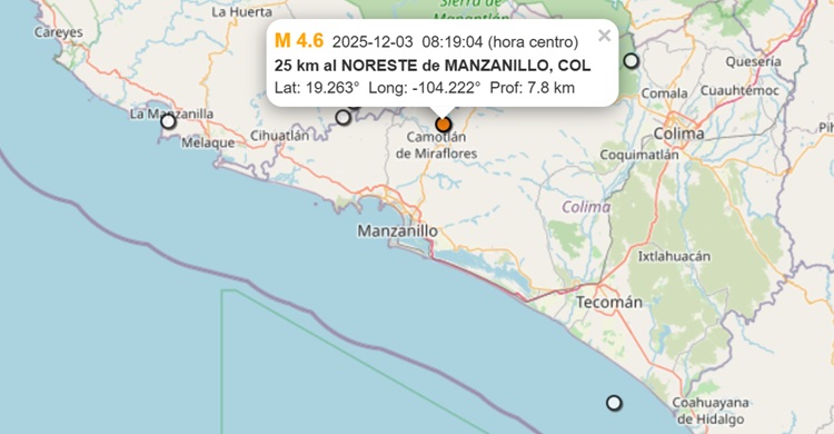 COAHUAYANA, Mich., 3 de diciembre de 2024.- Este miércoles, el Servicio Sismológico Nacional (SSN) reporta que a las 8:19 horas ocurrió un sismo de magnitud 4.6 cuyo epicentro se ubicó en el estado de Colima el cual fue referenciado a 25 kilómetros al noreste de Manzanillo, a una profundidad de 7.8 kilómetros, mismo que en Coahuayana fue percibido escuchándose primero un retumbo bajo el suelo y después un temblor leve que fue sentido por la gente.