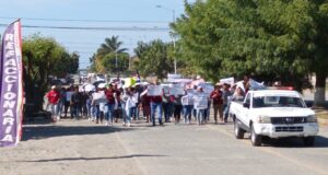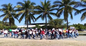 Los educadores comunitarios realizaron una marcha que inició en la glorieta de Cortador de Plátano y seguio por la avenida Ignacio López Rayón pasando por la presidencia municipal hasta llegar a las instalaciones de Conafe en Coahuayana en donde se instalaron en plantón permanente.