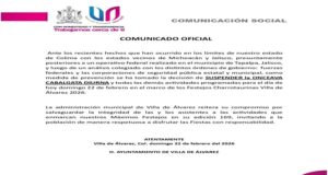 COLIMA, Col., 22 de febrero de 2026.- El Ayuntamiento de Villa de Álvarez anunció la suspensión de la onceava cabalgata diurna de este domingo 22 de febrero y de todas las actividades programadas para este día en la edición 169 de los Festejos Charro Taurinos, como medida preventiva ante los recientes hechos violentos registrados en los estados de Jalisco y Michoacán, presuntamente por un operativo realizado en el municipio jalisciense de Tapalpa.