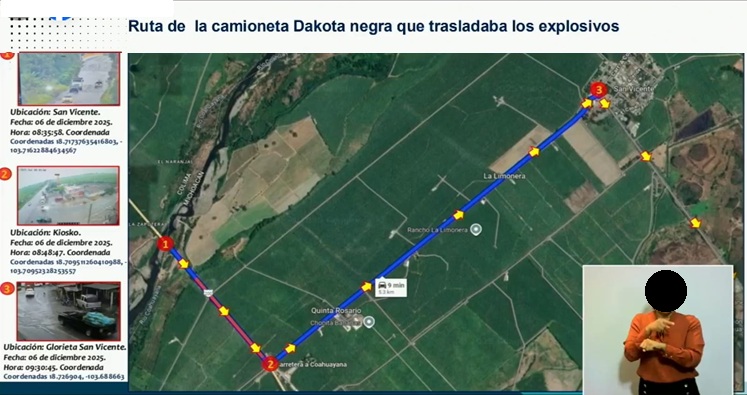 En transmisión oficial realizada en la página del gobernador Alfredo Ramírez Bedolla, Torres Piña afirmó que el vehículo cruzó por el puente Coahuayana, continuó su trayecto por la comunidad de San Vicente y posteriormente llegó a Coahuayana, donde finalmente fue detonado.